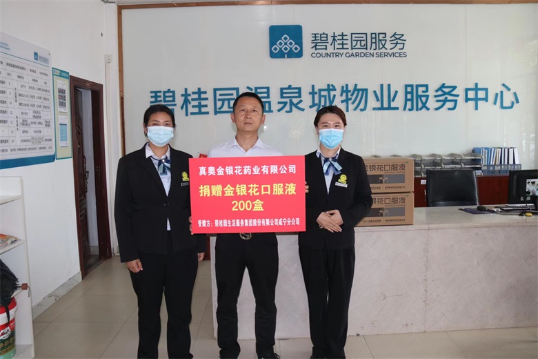 2022年11月10日,為了向奮斗在“疫”線默默付出的在崗員工表達(dá)關(guān)懷,真奧金銀花藥業(yè)向碧桂園生活服務(wù)集團(tuán)股份有限公司咸寧分公司捐贈200盒金銀花口服液。